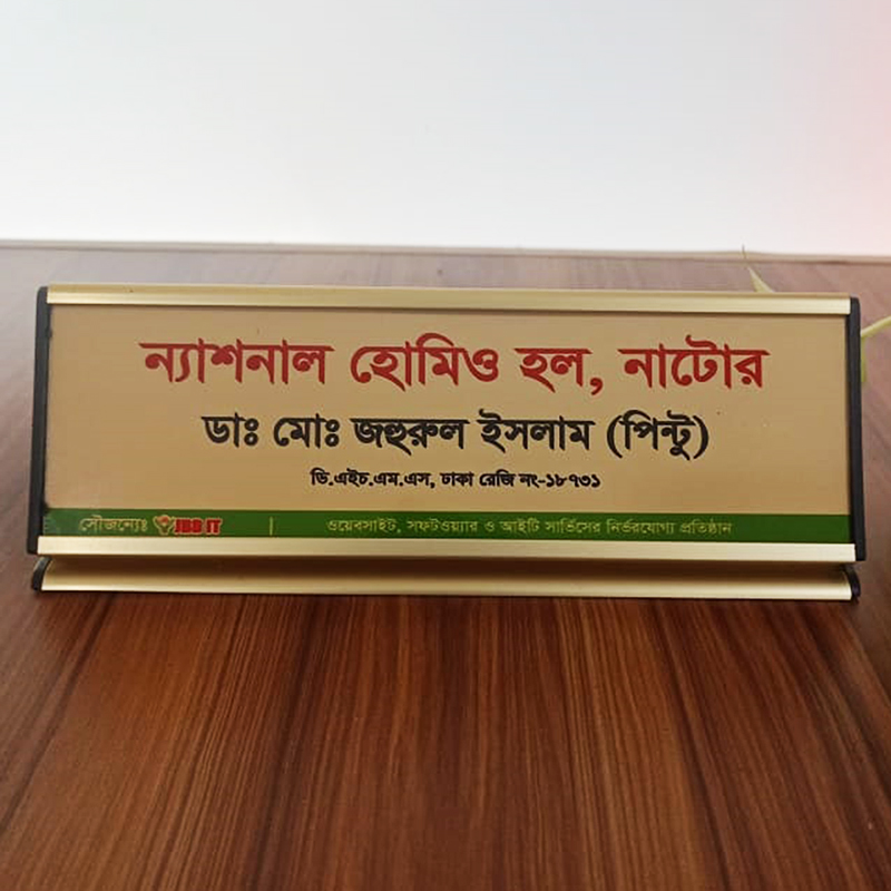 আপনি আমাদের কাস্টমাইজযোগ্য এসএস মেটাল টেবিল নেমপ্লেটি কম খরচে নিজের ইচ্ছামত ডিজাইন করে নিতে পারবেন। এটি যেকোনো স্কুল , কলেজ , মাদ্রাসা কিংবা অফিসের ডেস্কে ব্যবহার করতে পারবেন । আমরা উচ্চ মানের এসএস মেটাল দিয়ে নেমপ্লেটি তৈরি করে থাকি যেটি আপনার ডেস্কের সৌন্দর্যকে বাড়িয়ে তোলে।